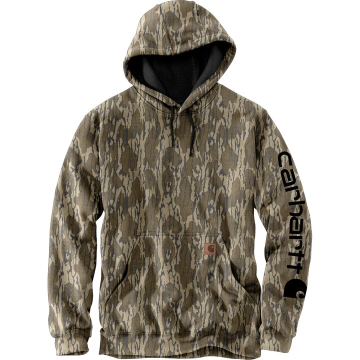 Carhartt® Men’s Loose Fit Midweight Camo Sleeve Graphic Logo Hooded Sweatshirt is ready for a long day on the job or in the woods. A trusted favorite for over 30 years, the Mossy Oak® Bottomland camouflage pattern blends into any hunting environment. Midweight Cotton blend fabric has a generous cut for easy layering.