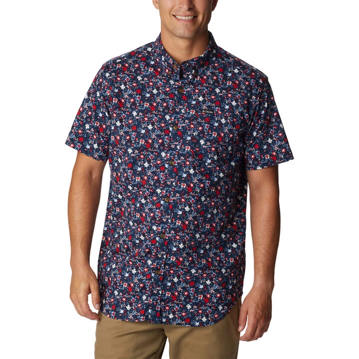 At the office or on the trail, you’ll be comfortable in Columbia® Men’s Rapid Rivers™ vibrant printed cotton short-sleeve button-up with a classic silhouette.