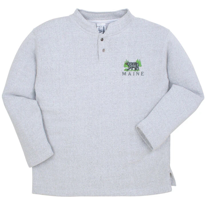 ESY® Men’s Maine Black Bear Two Button Henley Sweatshirt is a seasonal favorite for a warm cover up at the cottage or camp.