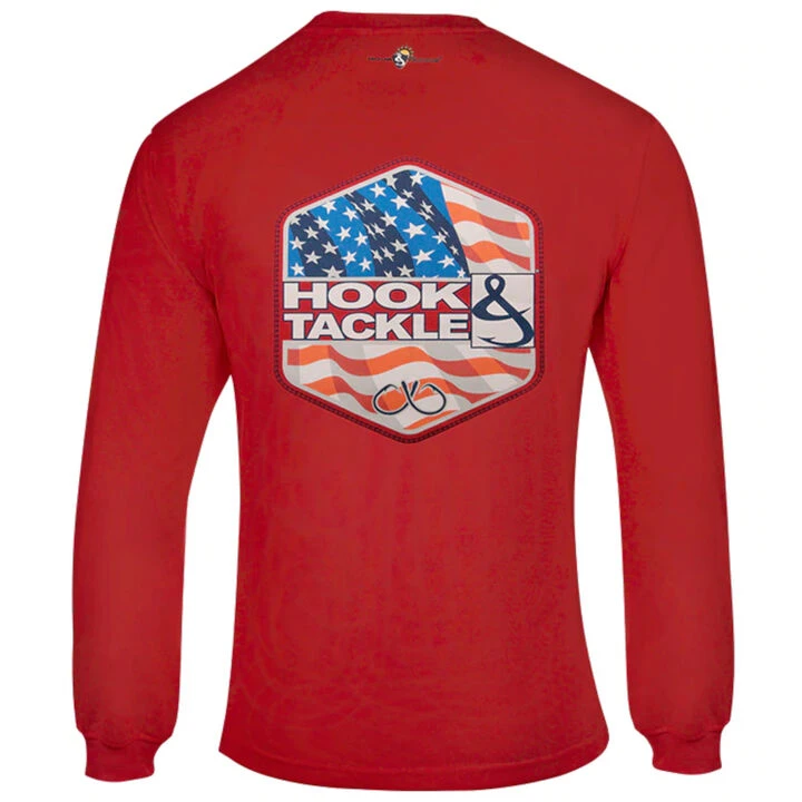 Hook & Tackle® Men’s Star Spangled Performance Fishing Long-sleeve Shirt features a shield containing the American flag on the rear and the Hook & Tackle® logo on one sleeve and on the front. Most sun protection fishing t-shirts in the marketplace are made of 100% synthetic fabric. They are hot, clammy, odor-prone, do not breathe and generally are very uncomfortable. Cotton fishing t-shirts are breathable and comfortable but do not provide effective sun protection.